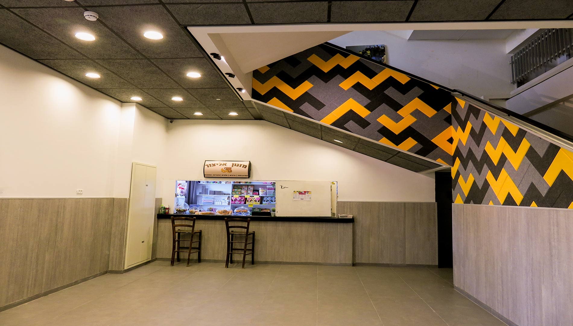 קיר אקוסטי עמיד לאש העשוי מחומרים ממוחזרים ניצב לו ממש בחזית הלובי ונותן לחלל יופי אשר מתאים לגוונים של המועדון.